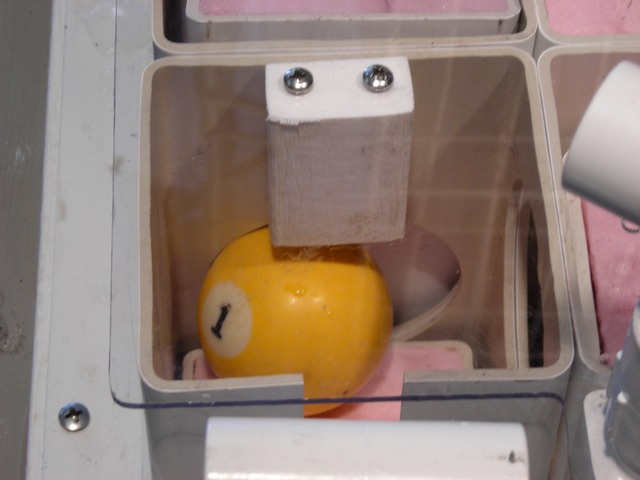 The 1 ball is on a trigger float. The trigger float and the trigger manifold cannot rise because the ball is under the trigger block (the thing with two screws). The connected Flout will flood and sink. Notice the ball is trapped by the following lift float.