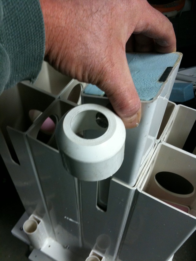 The trigger float (blue) rises and falls in the trigger cell. Trigger manifold attaches to the cup shaped bracket.