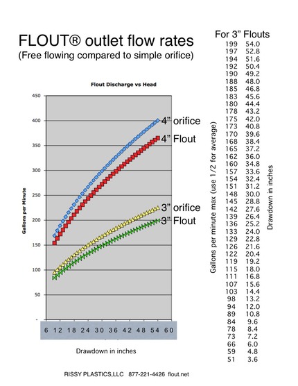 The average flow from any Flout is the same as the maximum flow of one with 1/2 of the original drawdown. Example: What is the average flow of a 3" Flout at 36" drawdown? It is the same as the maximum for a 3" Flout with 1/2 the drawdown (18") The average is 115 gpm.