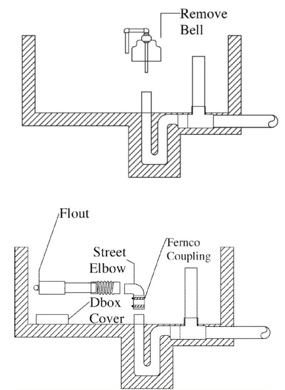 *The Flout can use the old trap or the old vent. When using the vent, a new vent should be provided. Use a tee instead of the elbow. The trap is sealed off with mortar.